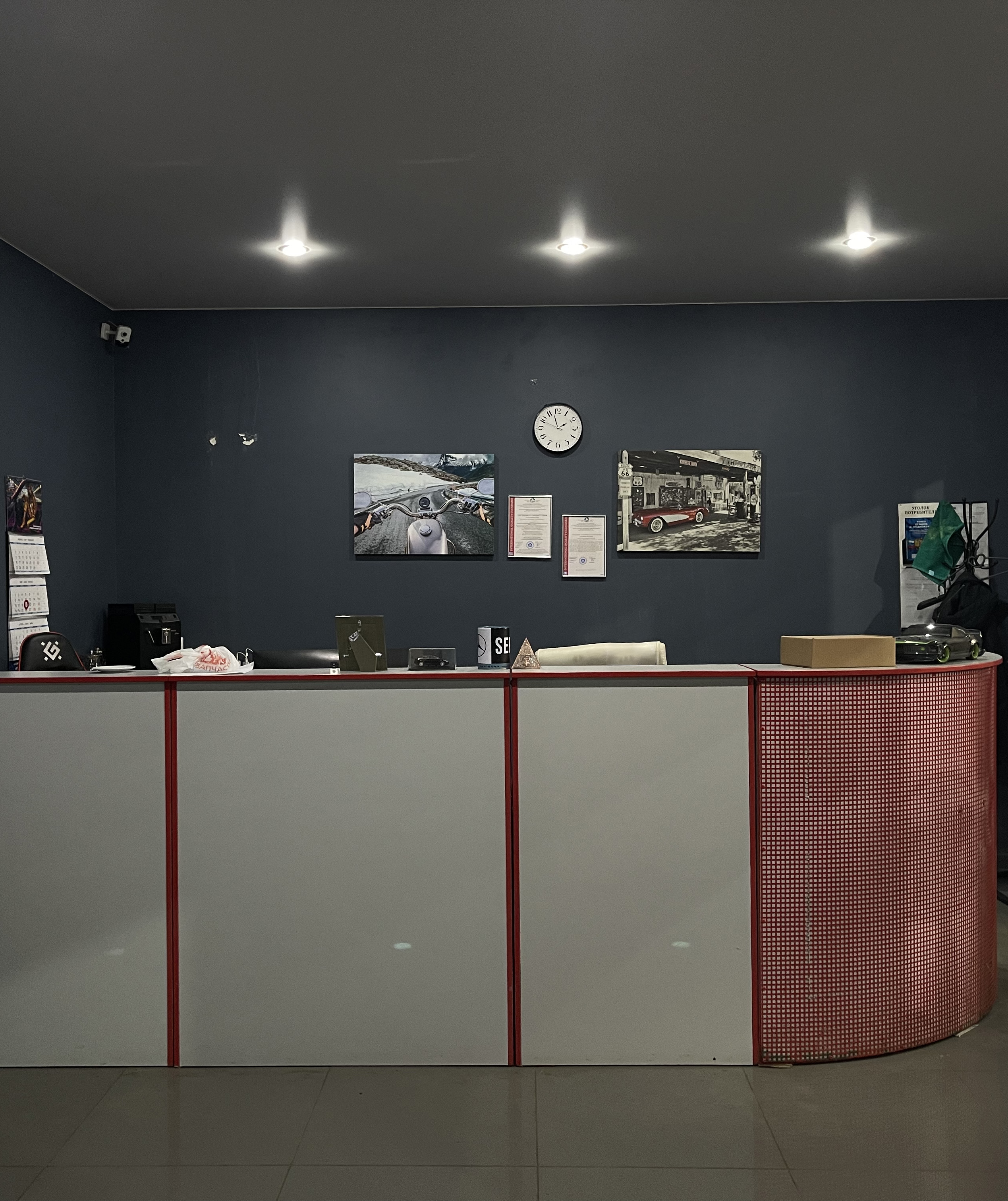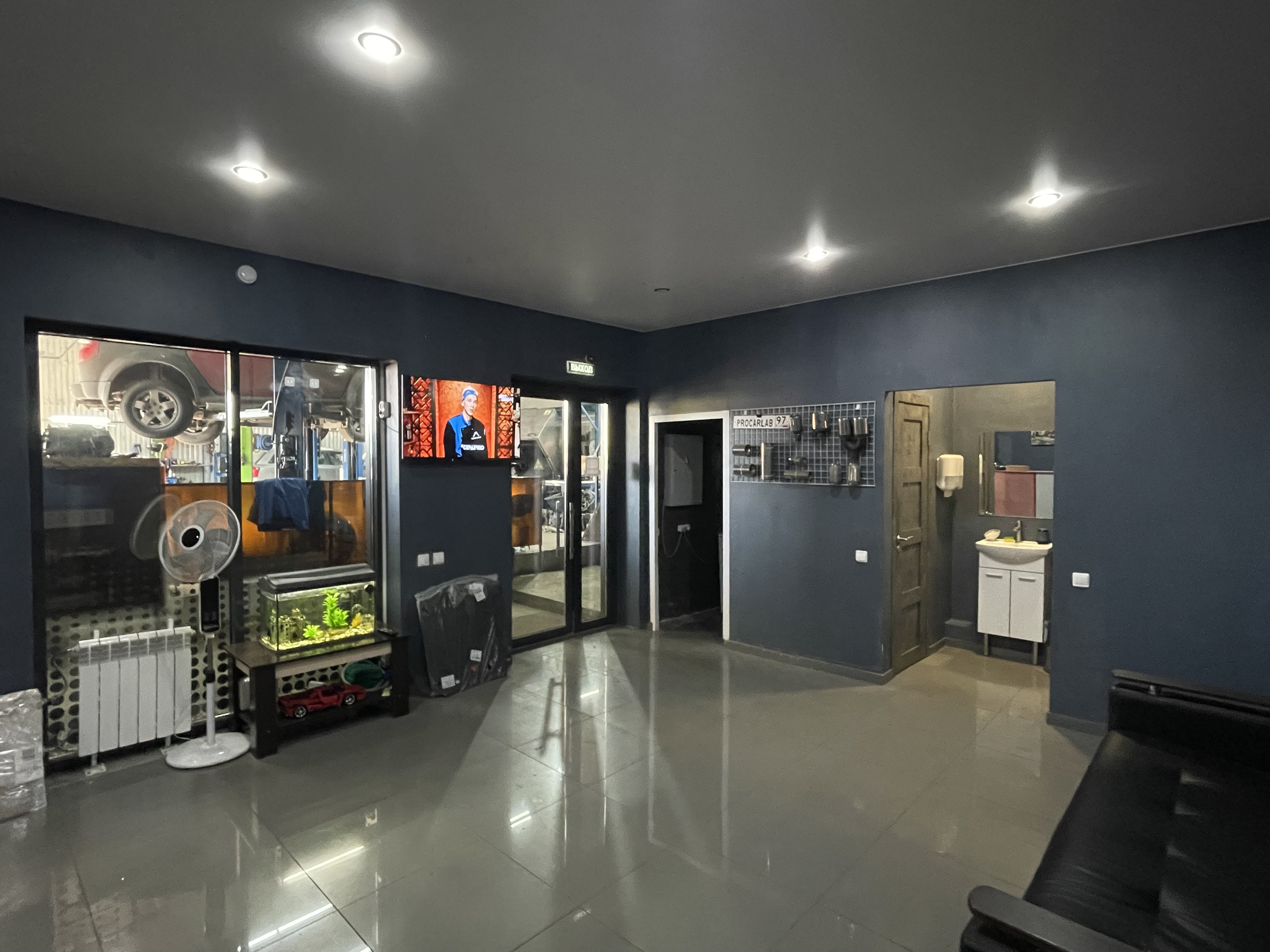 телевизор с разными каналами и панорамный обзор мастерской — можете лично следить, как мастера творят чудеса с вашим авто.